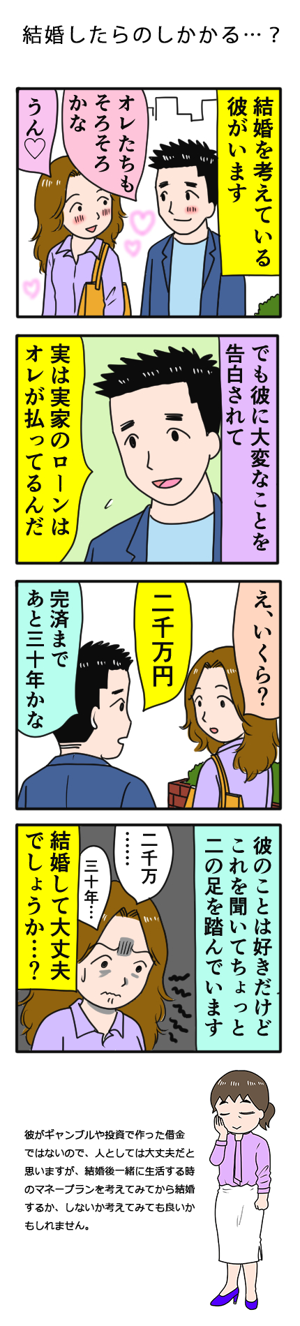 うーん、私なら結婚するほど大好きな相手であれば借金で別れるという選択はないですけどね。まあ、大事なものは人によって違うので、不安に思うならやめたほうが賢明かもしれません。三十年ローン、この先ずっとこのことが気になり続けてしまうだろうからです。でも、いい借金と悪い借金があるとすれば、彼のは悪い借金ではないですよ。