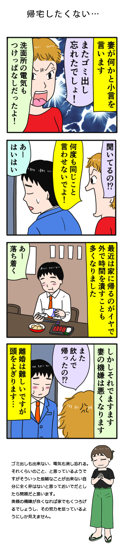帰宅拒否症、これを患っている人は私の周りにもいます。少しでも遅く帰りたい、出来れば配偶者が寝てしまってから家のドアを開けたい人。人生に長く関わる問題をその日その日で凌いでるだけなんですね。でもいずれ真正面から向き合う日は来ます。自分の家を居心地良くするのは自分にかかっています。離婚するまでもないと思っているかもしれませんが、結構根深い大問題ですよ。