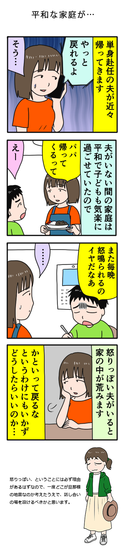 勿論「帰ってくるな」とは言えませんね。でも子どもが過ごしやすい家庭を作ることは親の義務。夫がむやみにキレないようにきちんと言い含める、それが無理なら離婚も辞さない覚悟でいるべきじゃないでしょうか。子どもの環境優先で考えてください。